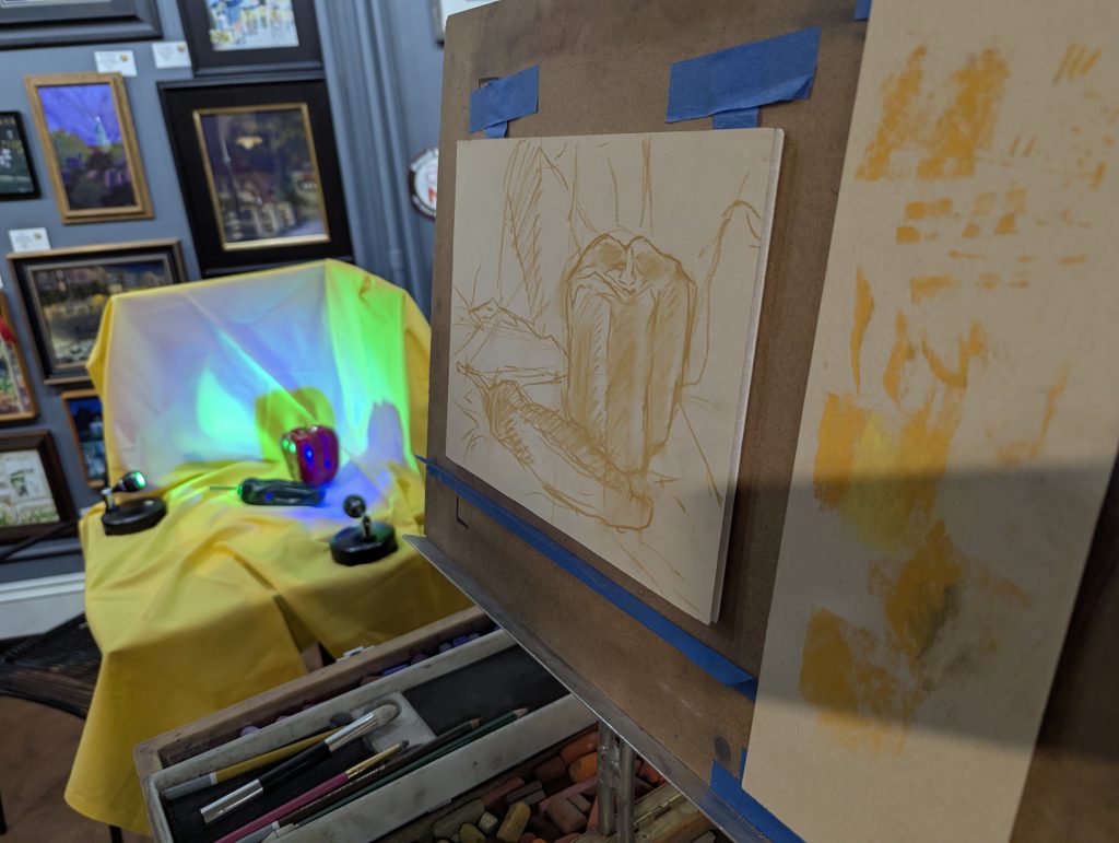 As a pastelist, Mary Beth showed how she works with saturated color and gestural mark-making. She works in her studio and en plein air, often creating studies from direct observation. Her goal is to capture while observing portraits of the landscape, animals, or figures. Mary Beth explained her approach to document these experiences, which can be quickly notated in pastel through bold and suggestive strokes.