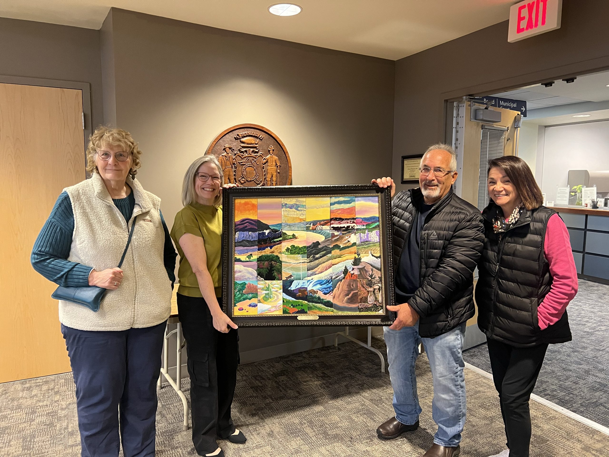 Members selected to reinterpret Thomas Hart Benton’s landscape, “Lewis and Clark at Eagle Creek” as our 2025 masterpiece. Members assembled 24 finished pieces of of this year’s masterpiece, were finally able to admire the full project at our May 27th meeting before sending off to be framed.